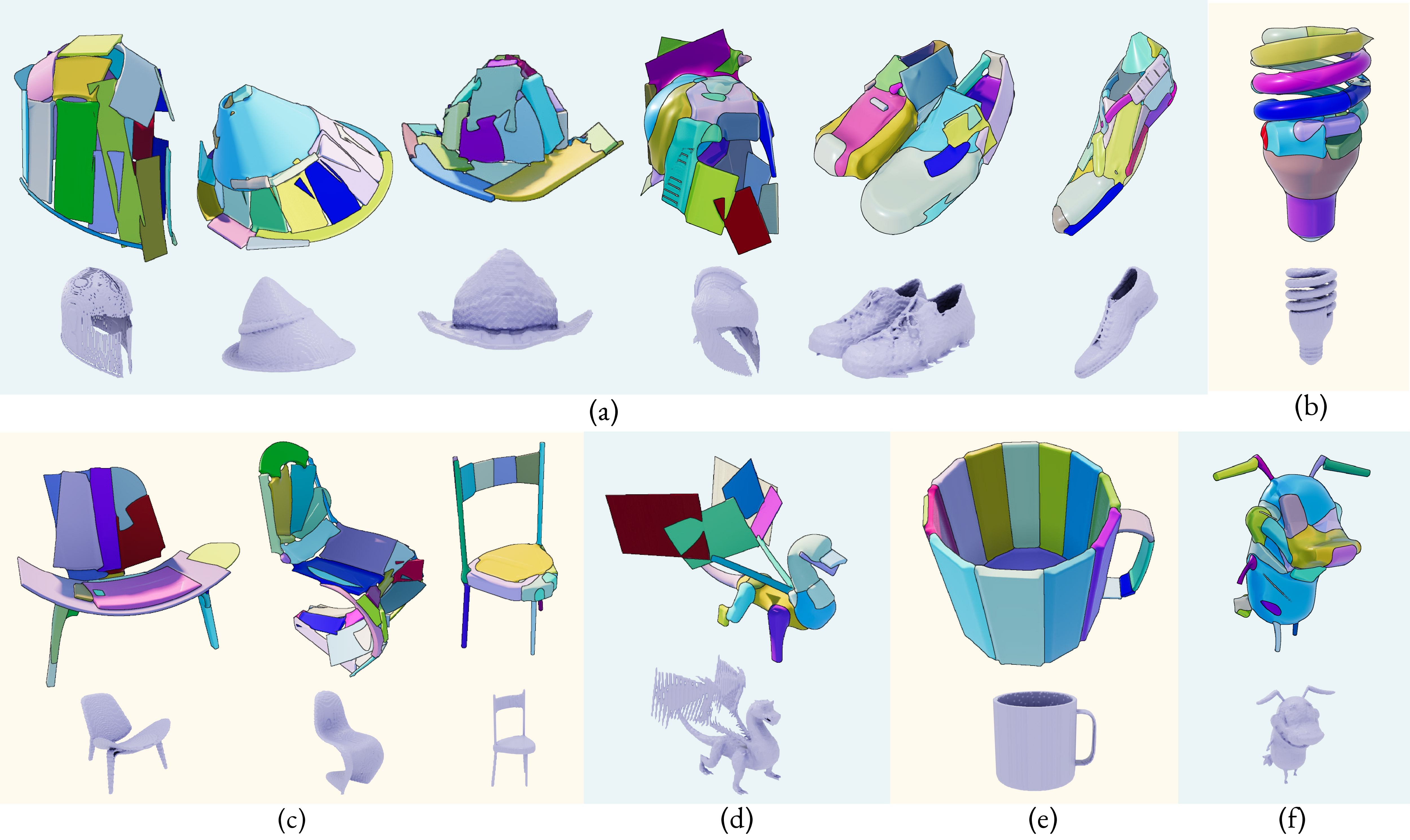 Our method produces assemblies with higher geometric fidelity and significantly less primitive overlap compared to prior methods. While baselines often generate fragmented or heavily overlapping primitives, our approach yields compact, semantically meaningful decompositions.