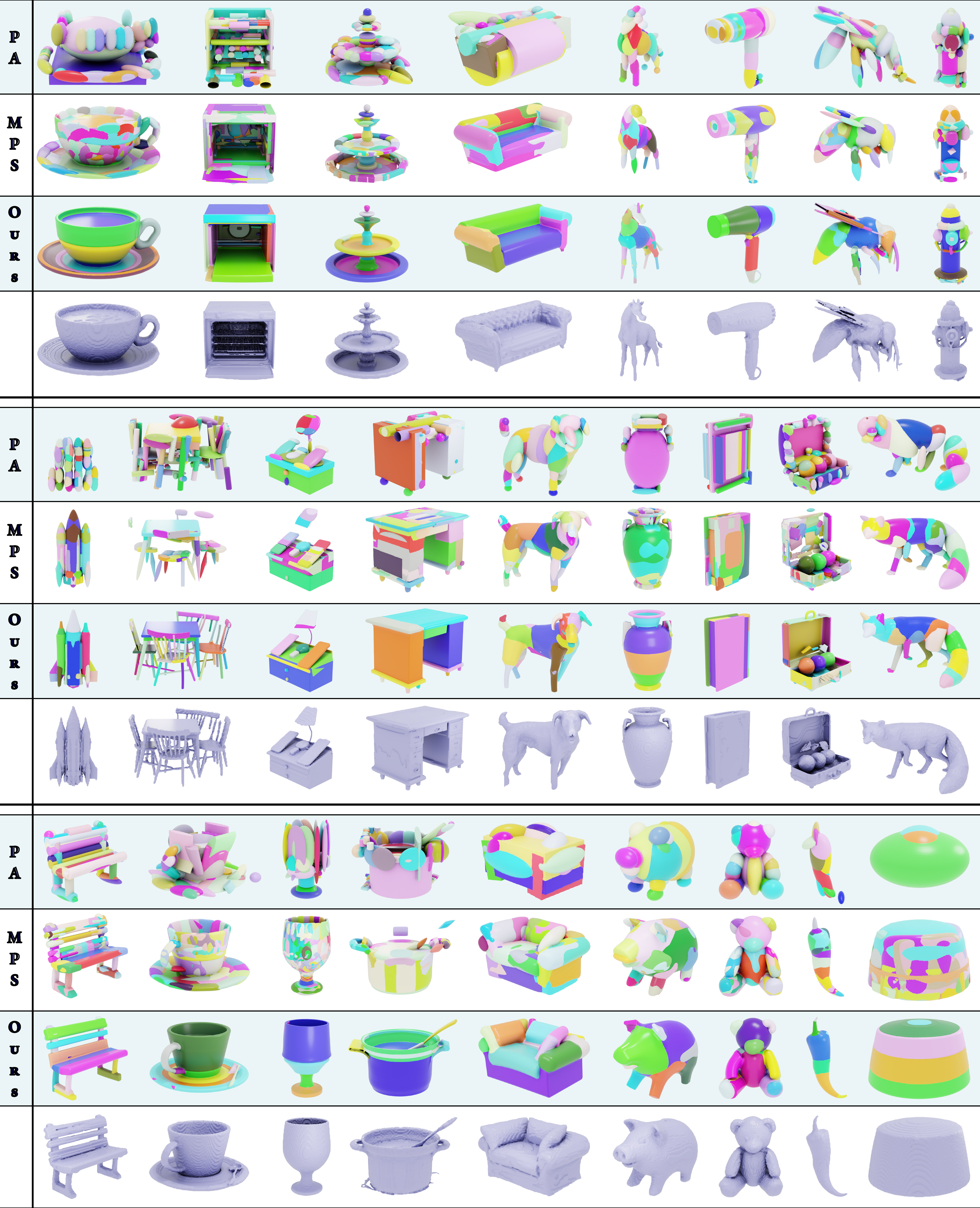 Our approach redefines the reconstruction–parsimony Pareto Frontier. Compared to state-of-the-art methods like Marching Primitives (MPS) and Primitive Anything (PA), we achieve markedly lower reconstruction error using significantly fewer primitives.