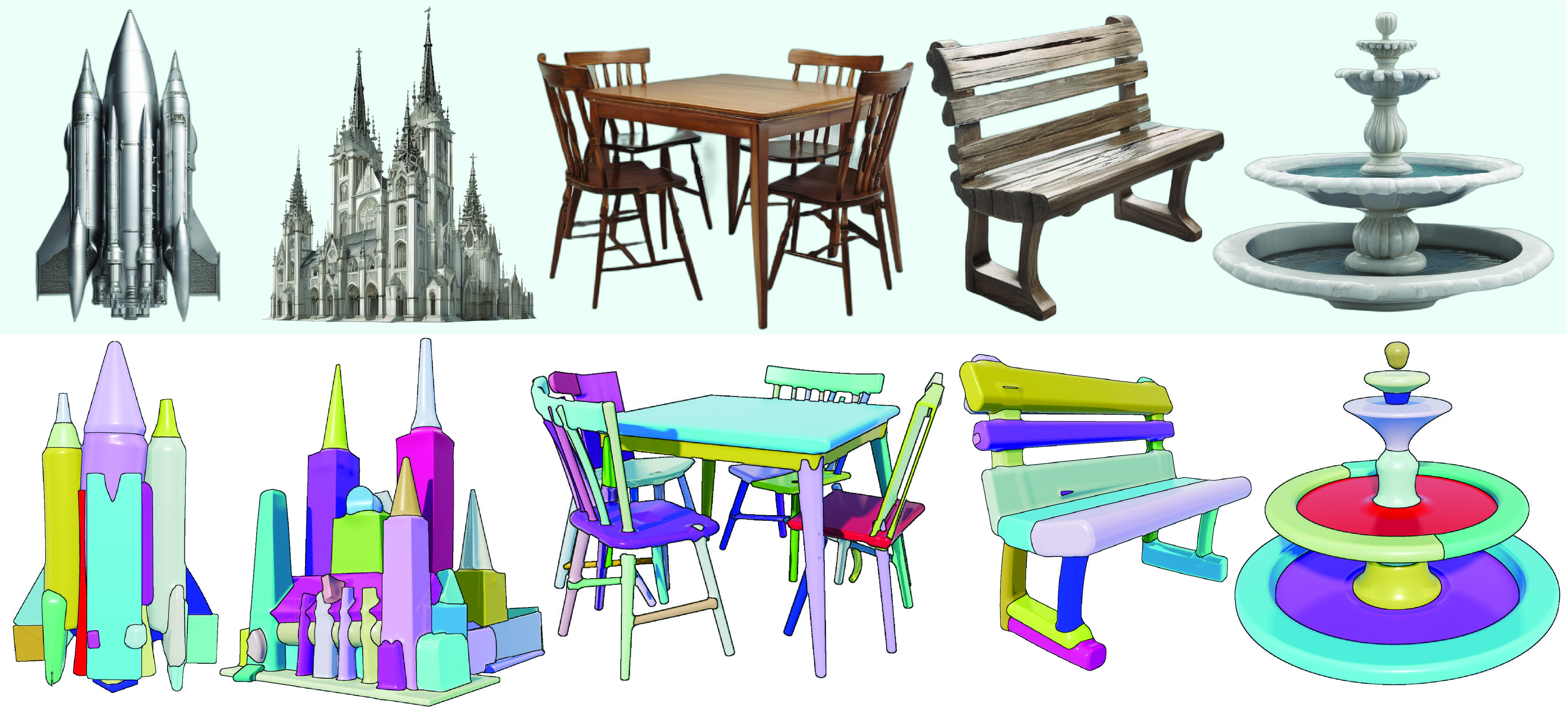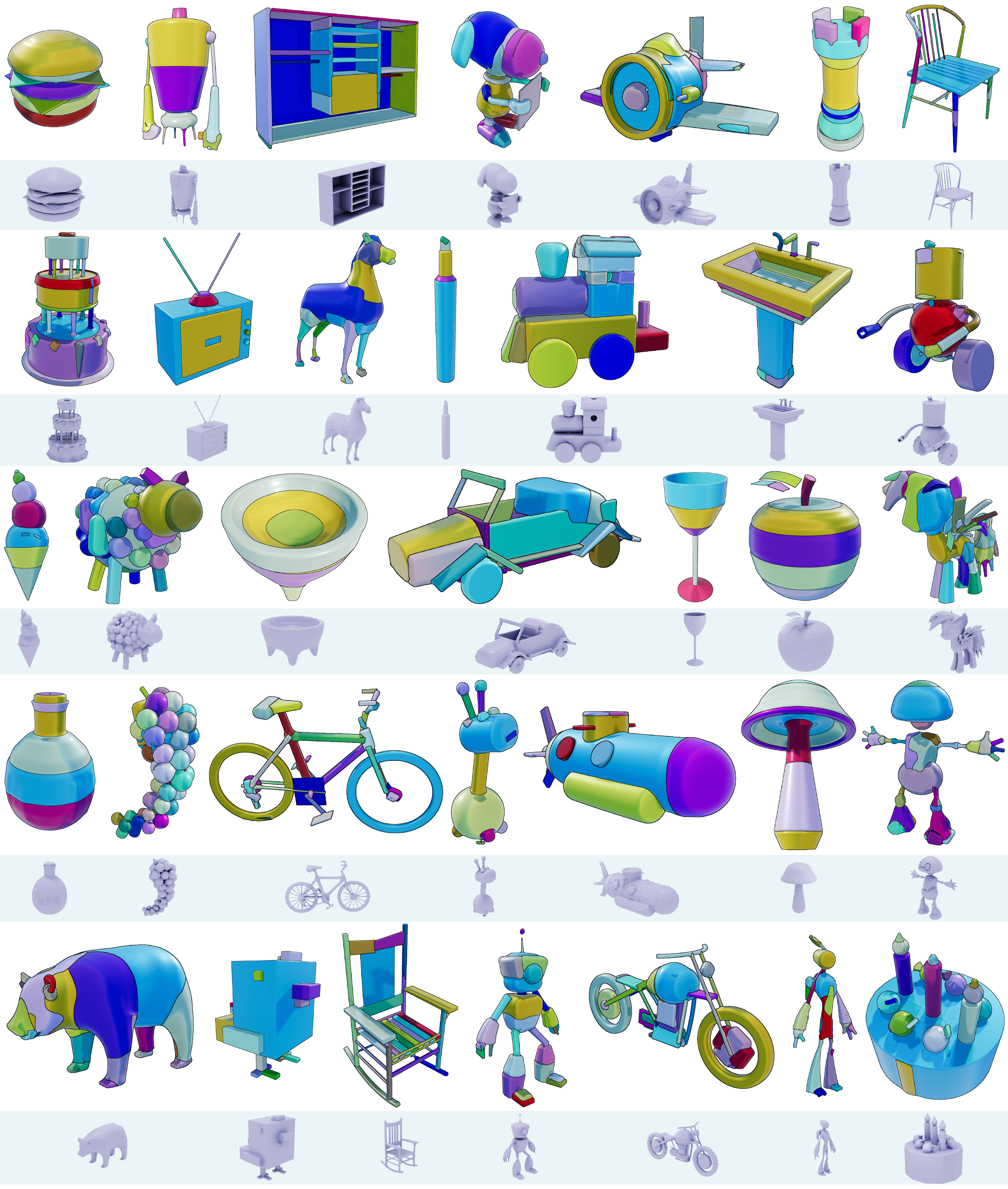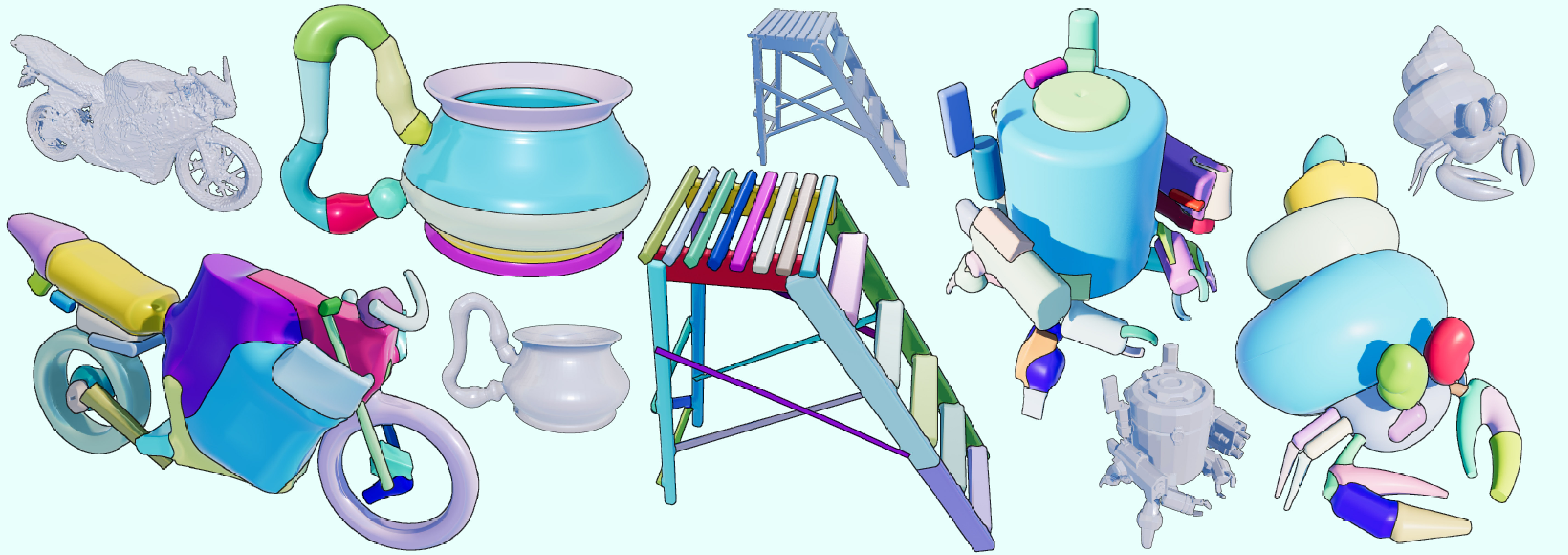 Our primitive assemblies capture a wide range of shapes, including hollow forms (wine glass), curved & toroidal parts (bikes, bowls), intricate geometry (robots, grapes), and smooth organic shapes (horse, bear). The assemblies are simultaneously accurate, compact, and semantically interpretable.
