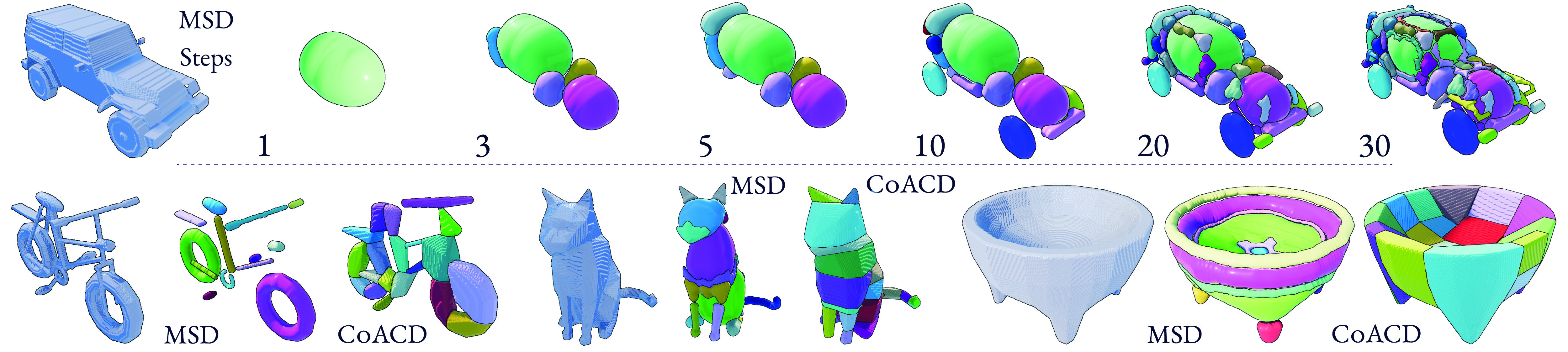 ResFit initializes primitives from volumetric regions produced by Morphological Shape Decomposition (MSD). MSD is an iterative "peel the thickest part first" technique: at each step, it finds the largest connected region of roughly uniform thickness, extracts it, removes it from the shape, and repeats on the residual. This yields regions that form suitable initialization seeds for SuperFrusta—capturing non-convex structures such as bicycle tires, curved tails, and bowl rims that convex decomposition methods would over-partition.