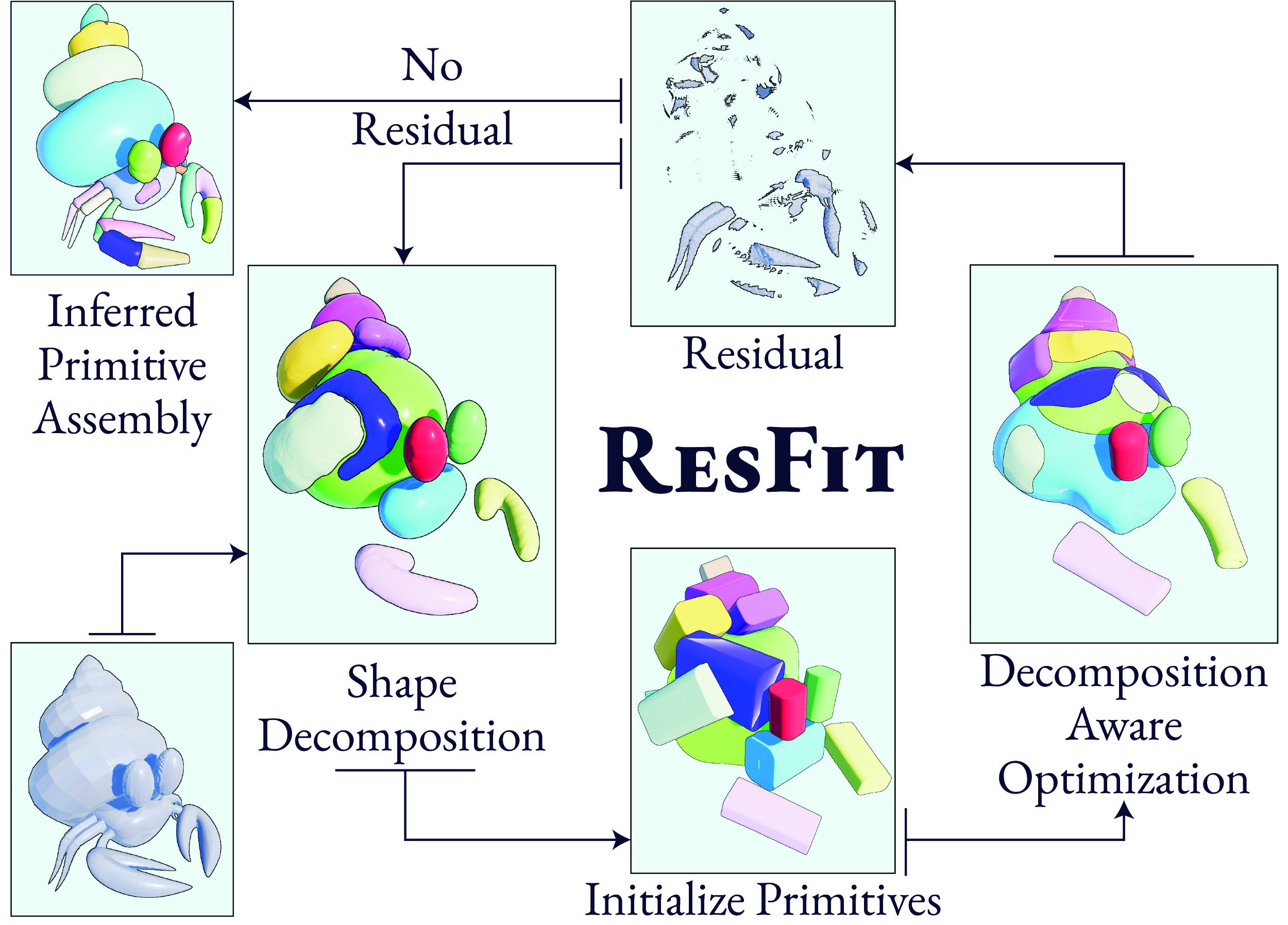 Instead of optimizing a large set of primitives jointly from scratch, ResFit first analyzes the input geometry to propose initial structures based on global cues. These primitives are then refined via gradient descent to conform to the local geometry.