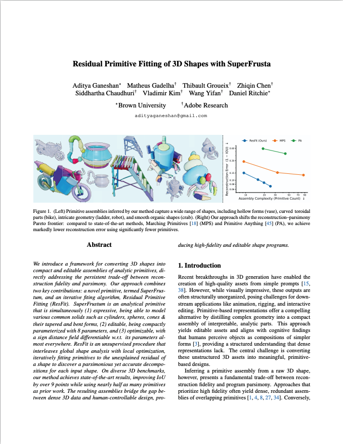 G (constrain with X, Y, or Z)SEscWe introduce a framework for converting 3D shapes into compact and editable assemblies of analytic primitives, directly addressing the persistent trade-off between reconstruction fidelity and parsimony. Our approach combines two key contributions: a novel primitive, termed SuperFrustum, and an iterative fitting algorithm, Residual Primitive Fitting (ResFit). SuperFrustum is an analytical primitive that is simultaneously (1) expressive, being able to model various common solids such as cylinders, spheres, cones and their tapered and bent forms, (2) editable, being compactly parameterized with only 8 parameters, and (3) optimizable, with a signed distance field differentiable w.r.t. its parameters almost everywhere. ResFit is an unsupervised procedure that interleaves global shape analysis with local primitive optimization, iteratively fitting primitives to the unexplained residual of a shape to discover parsimonious yet accurate decompositions for each input shape. On diverse 3D benchmarks, our method achieves state-of-the-art results, improving IoU by over 9 points while using nearly half as many primitives as prior work. The resulting assemblies bridge the gap between dense 3D data and human-controllable design, producing high-fidelity and editable shape programs.