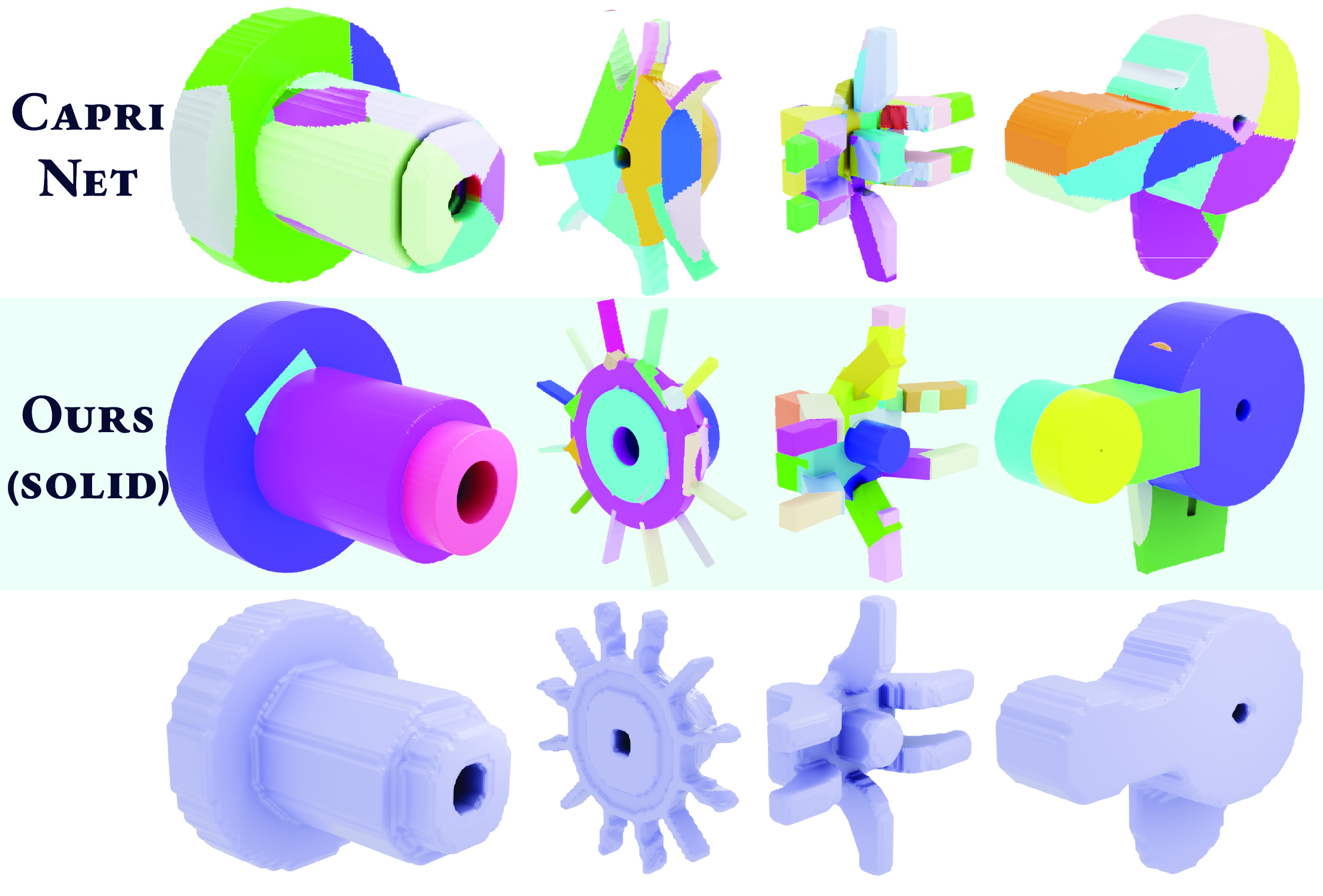 Although our framework is designed for smooth, soft-union assemblies, it can also infer discrete Constructive Solid Geometry (CSG) programs composed of canonical solids (cuboids, cylinders, cones, spheres). Our approach achieves nearly the same CSG reconstruction accuracy as dedicated methods while using fewer primitives.