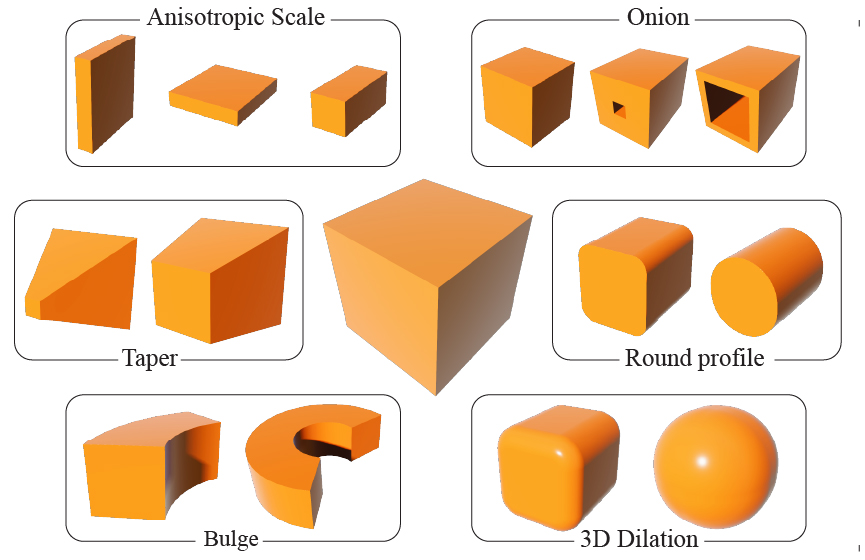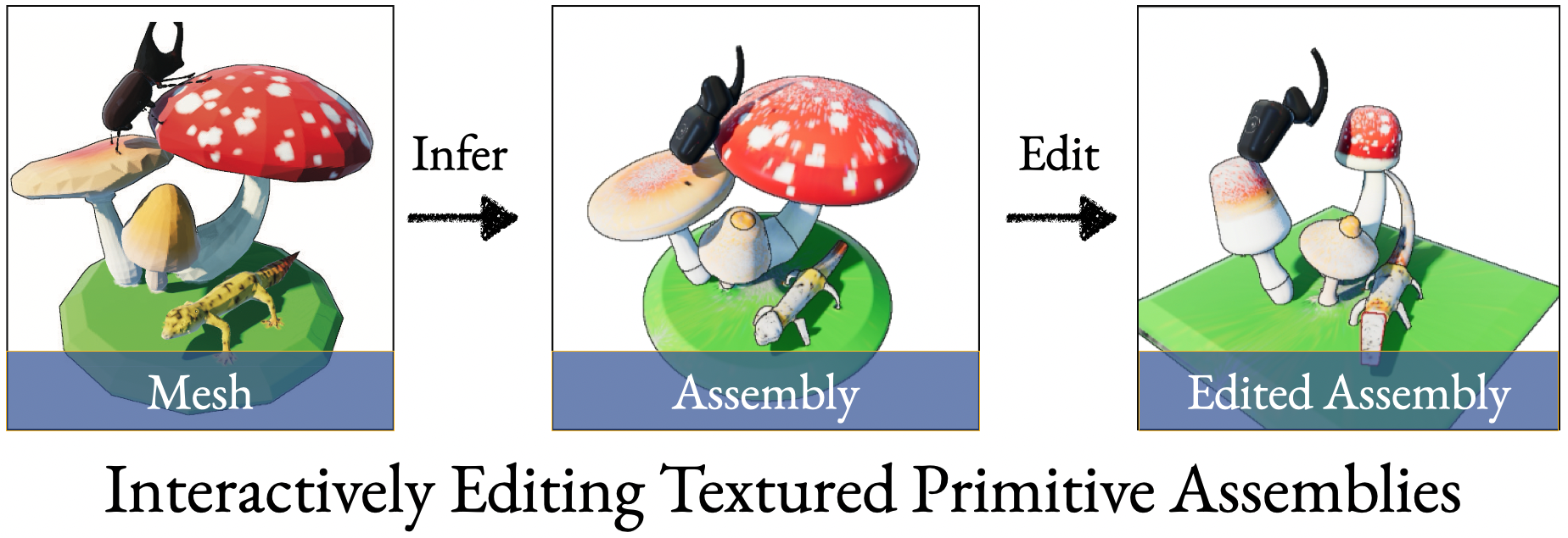 We can convert textured meshes into textured primitive assemblies, which makes many edits significantly easier to perform. More importantly, we can render and interact with these assemblies directly in a simple WebGL shader—highlighting the efficiency and deployability of our representation. The compact analytic form of SuperFrusta enables real-time sphere tracing with interactive editing capabilities, all running efficiently in the browser. More details here.
